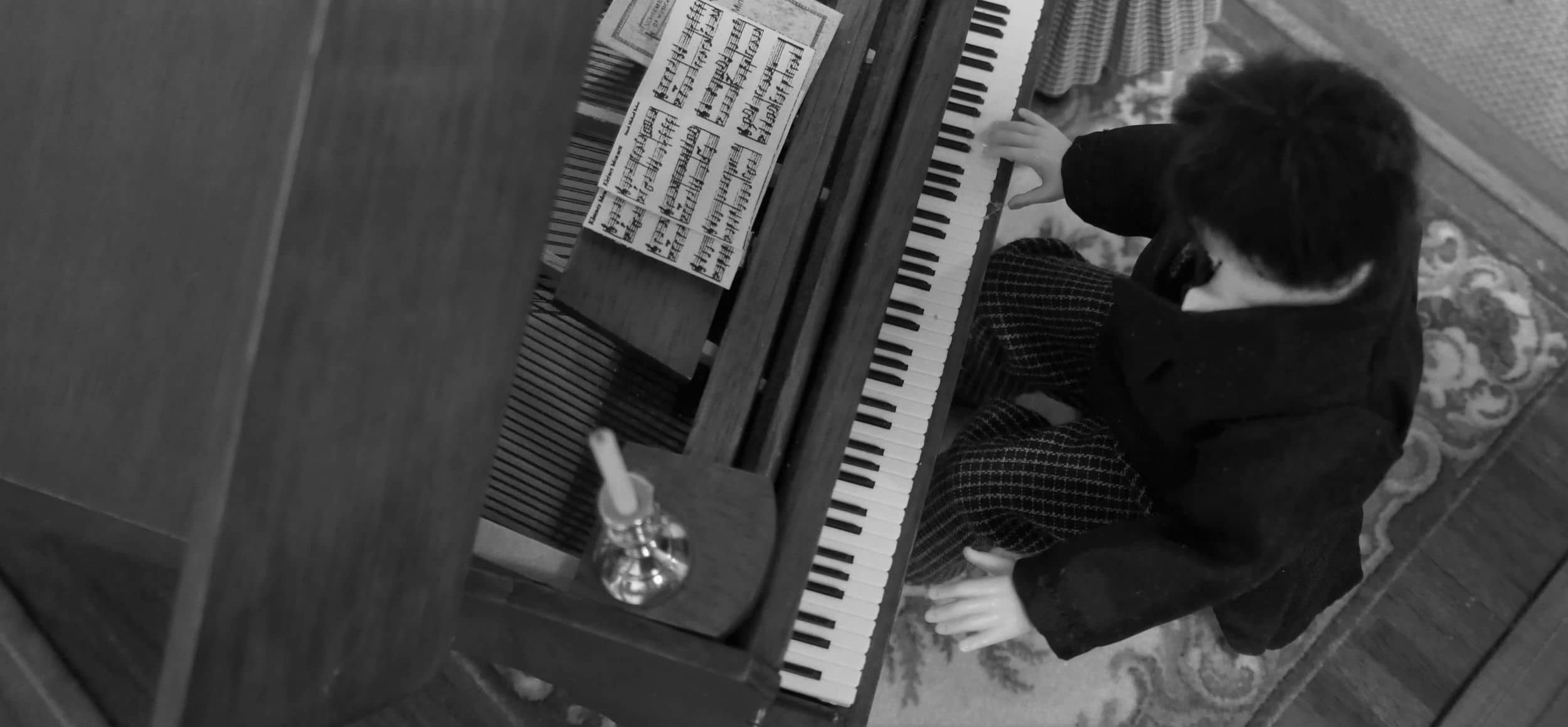 The room with a pianist and his young admirer. The banjo clock on the wall was made from a laser cut kit, and the piano was also from a kit.
